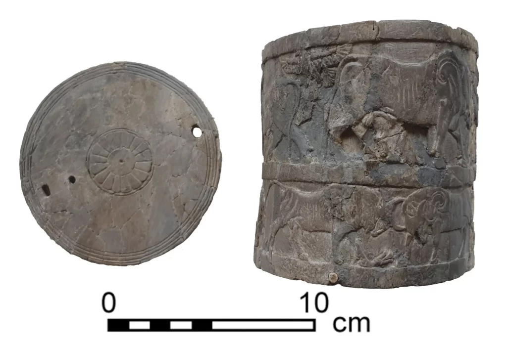 Una pyxis (caja cilíndrica) de marfil de una sola pieza y su tapa encontrada en Tel Lachish. (Cortesía del Museo de Israel)