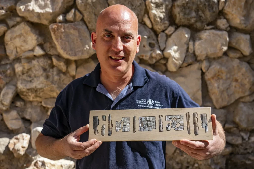El Dr. Yiftah Shalev de la Autoridad de Antigüedades de Israel con las incrustaciones de marfil reconstruidas de los siglos VIII y VII en la Ciudad de David de Jerusalén. (Yaniv Berman, Autoridad de Antigüedades de Israel)