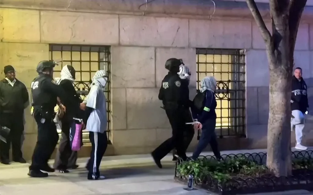 Manifestantes antiisraelíes fueron desalojados y arrestados por la policía tras ocupar la Biblioteca Butler de la Universidad de Columbia el 7 de mayo de 2025 en la ciudad de Nueva York. (Anusha Subramanian vía Reuters)