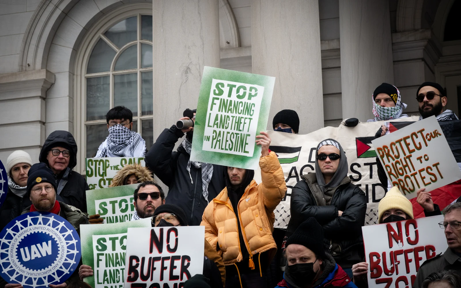 La Unión de Libertades Civiles de Nueva York, el grupo Judíos por la Justicia Económica y Racial, la organización antisionista Voz Judía por la Paz y Pal-Awda, que encabezó las protestas frente a sinagogas, llamaron a concentrarse en las escalinatas del Ayuntamiento para rechazar la sesión del comité.