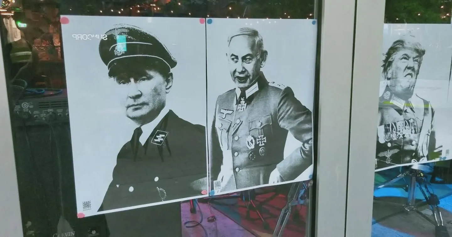 En la ventana del local aparecían letreros con los mensajes “Sancionen a Israel” y “Detengan el genocidio”. Otros carteles representaban con uniformes nazis al presidente de Estados Unidos Donald Trump, al vicepresidente JD Vance y al multimillonario Elon Musk. El establecimiento, Dissent Cafe and Bar, sostuvo que las imágenes se concibieron como sátira.