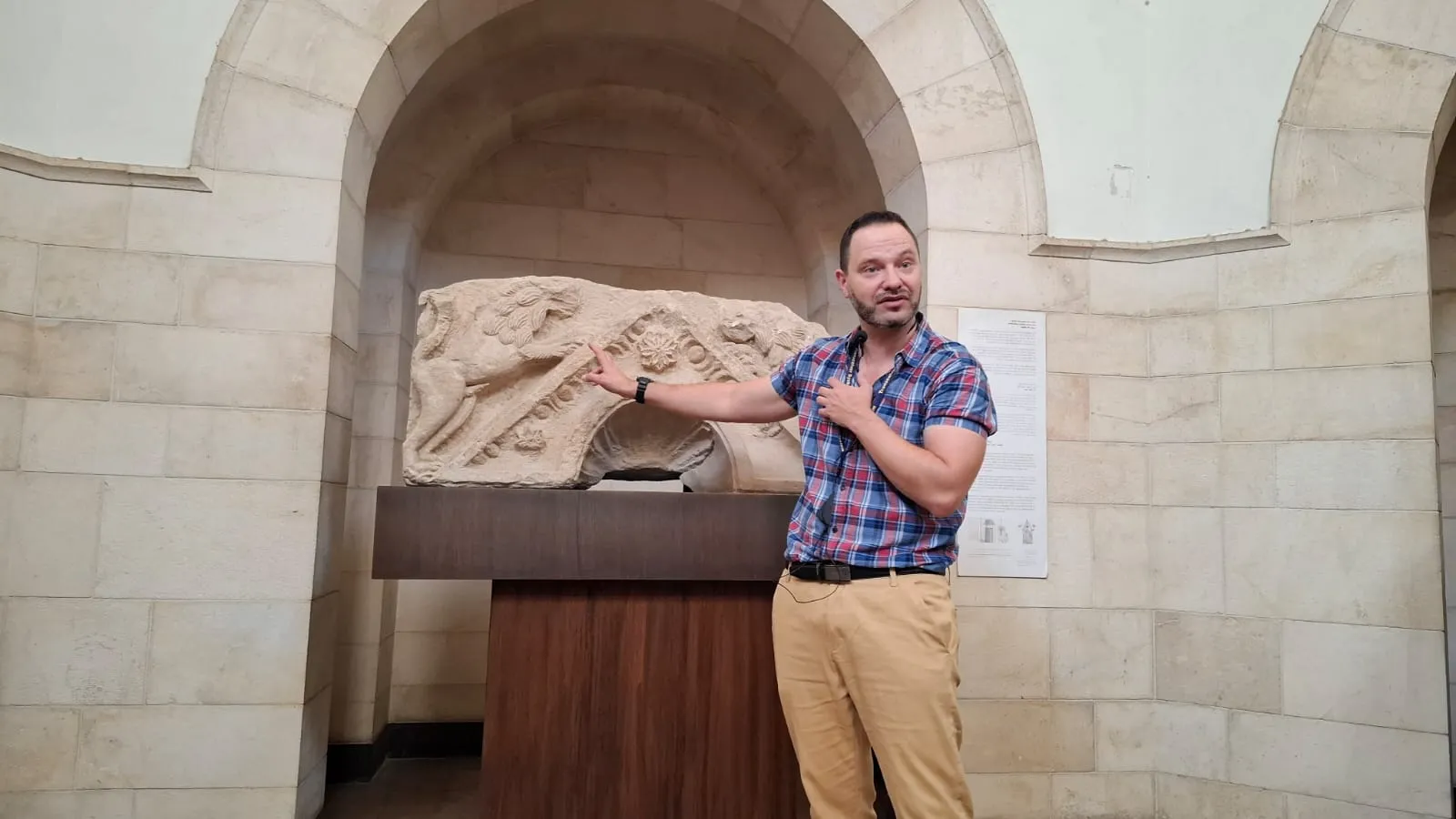 Tras ver vitrinas con artefactos de muchos siglos, el guía llevó a los presentes hacia un extremo de una columnata. Allí señaló una piedra sencilla sobre un pedestal bajo. El tamaño y el aspecto discreto contrastan con el peso histórico que, según su explicación, guarda la inscripción. Ni la ubicación de la pieza ni su rótulo permiten captar su relevancia de inmediato, y el visitante puede pasar frente a ella sin advertirlo.