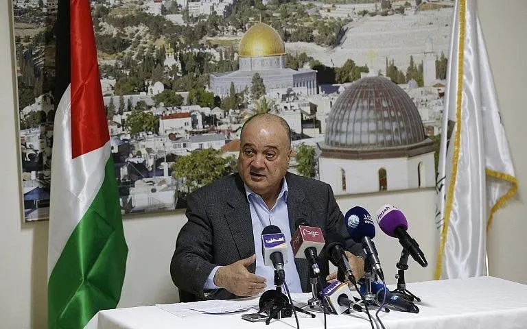 Nasser al-Qudwa, miembro del Comité Central de Fatah y sobrino del difunto líder palestino Yasser Arafat, comparece en una conferencia de prensa en Ramala, Judea y Samaria, el 23 de enero de 2019, con la mezquita Cúpula de la Roca de Jerusalén como telón de fondo, para comentar la decisión de un tribunal israelí de emitir un gravamen temporal sobre un terreno perteneciente a Arafat en el Este de Jerusalén. (ABBAS MOMANI / AFP)
