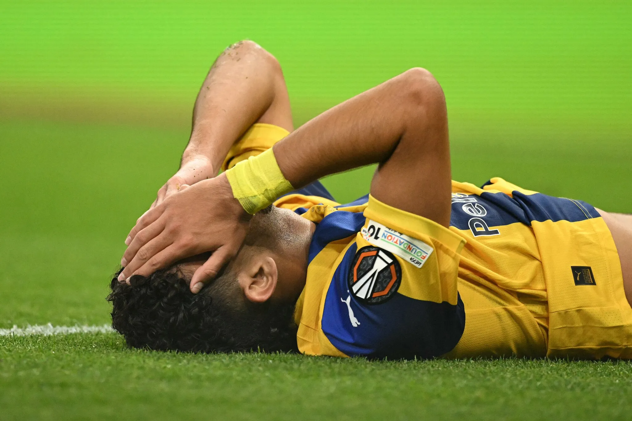 El defensa israelí del Maccabi Tel Aviv, Roy Revivo, cae lesionado durante el partido de fútbol de la fase de la UEFA Europa League entre Aston Villa y Maccabi Tel Aviv en Villa Park en Birmingham el 6 de noviembre de 2025. (Foto de Oli SCARFF / AFP)