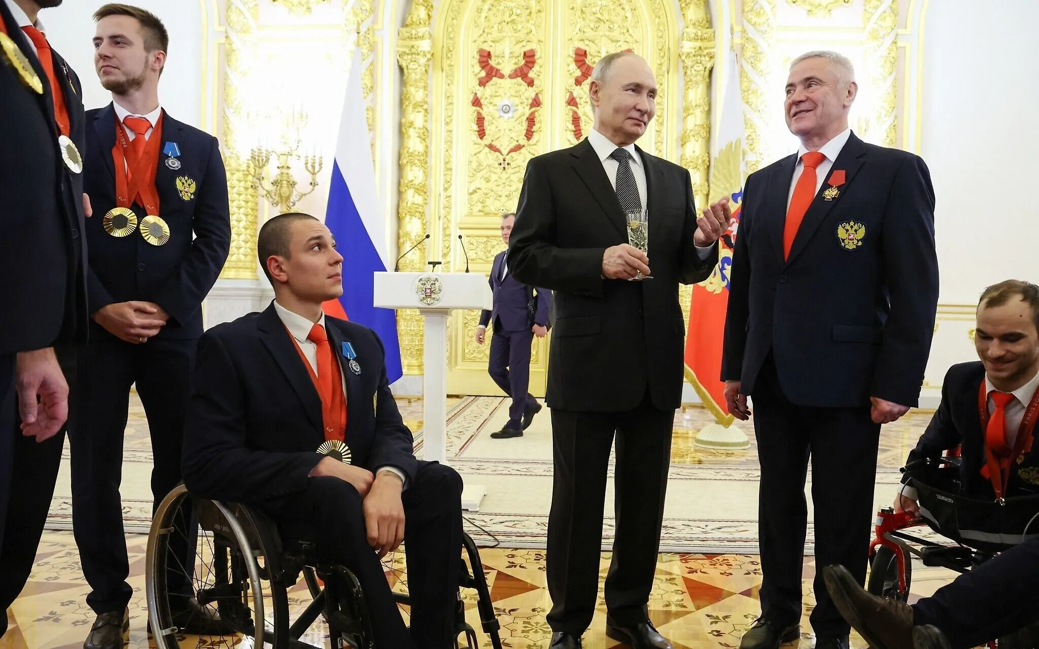 En esta fotografía de la piscina, distribuida por la agencia estatal rusa Sputnik, el presidente de Rusia, Vladimir Putin, aparece con un vaso entre los atletas paralímpicos rusos, medallistas de los Juegos Paralímpicos de París 2024, tras la ceremonia de entrega de premios estatales en el Kremlin de Moscú, el 16 de diciembre de 2024. (Alexander KAZAKOV / POOL / AFP)