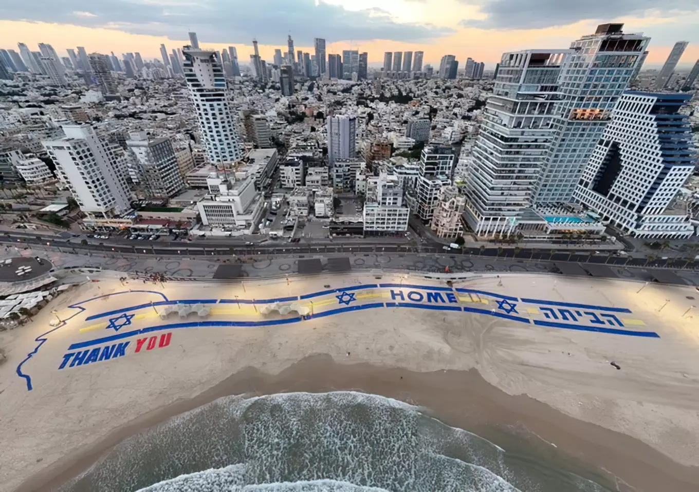 Los aviones que aterrizan en Israel suelen sobrevolar la playa de Tel Aviv al acercarse al aeropuerto Ben Gurion, por lo que el presidente podría ver las palabras desde el Air Force One.