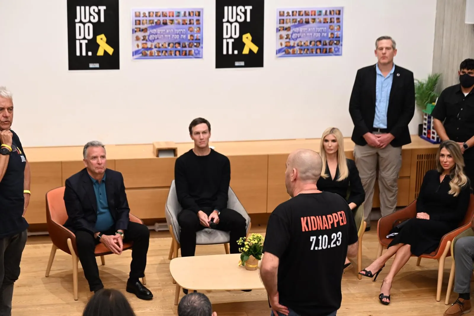 Steve Witkoff, a la izquierda, y Jared Kushner, segundo a la izquierda, escuchan mientras Ofir Braslavski habla en Tel Aviv el 11 de octubre de 2025. (Paulina Patimer / Sede del Foro de Familias de Rehenes)