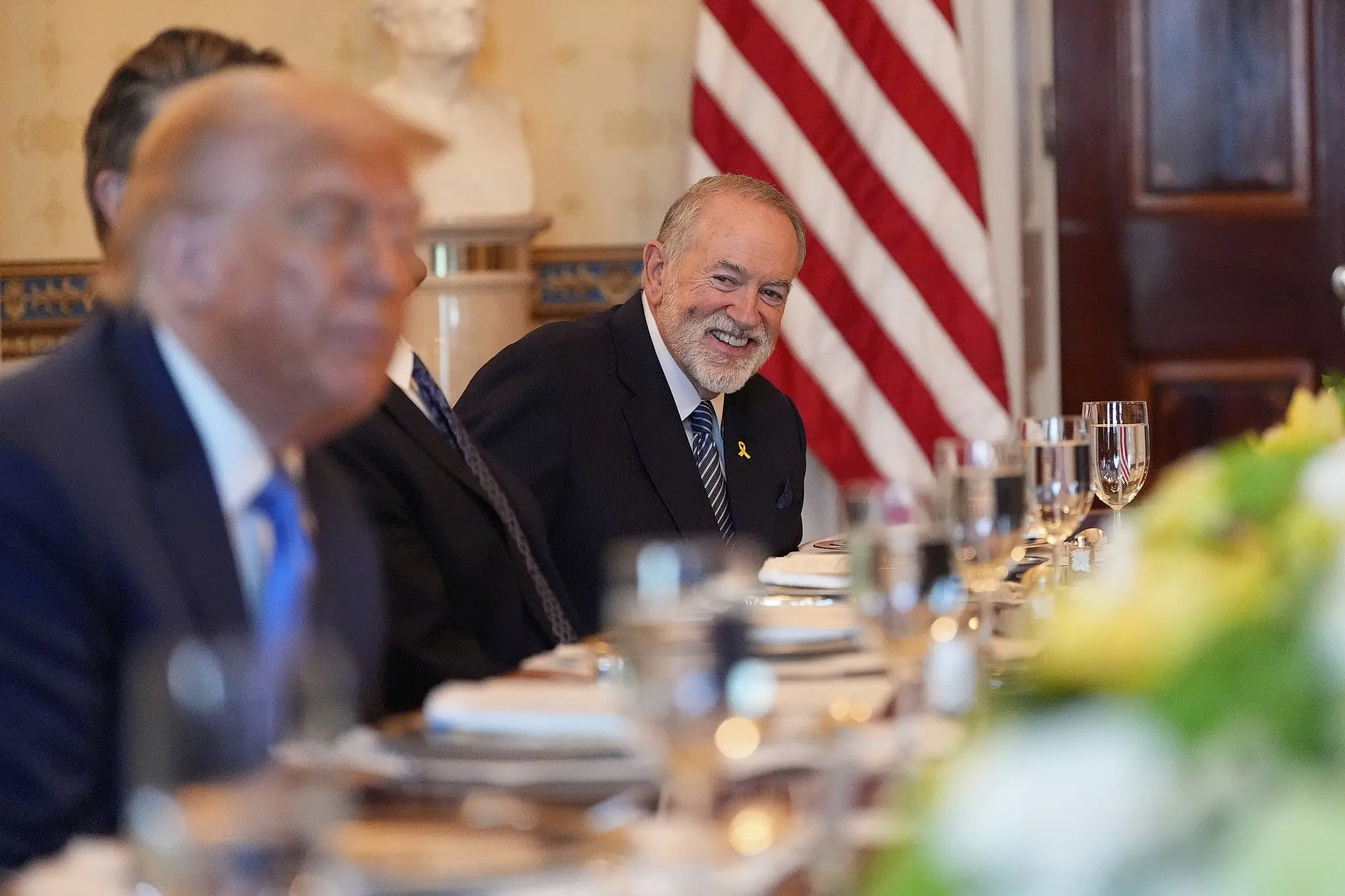 El embajador de Estados Unidos en Israel, Mike Huckabee, observa al presidente Donald Trump (en primer plano a la izquierda) mientras se reúne con el primer ministro israelí, Benjamin Netanyahu, en la Sala Azul de la Casa Blanca, el lunes 7 de julio de 2025, en Washington. (Foto AP/Alex Brandon)