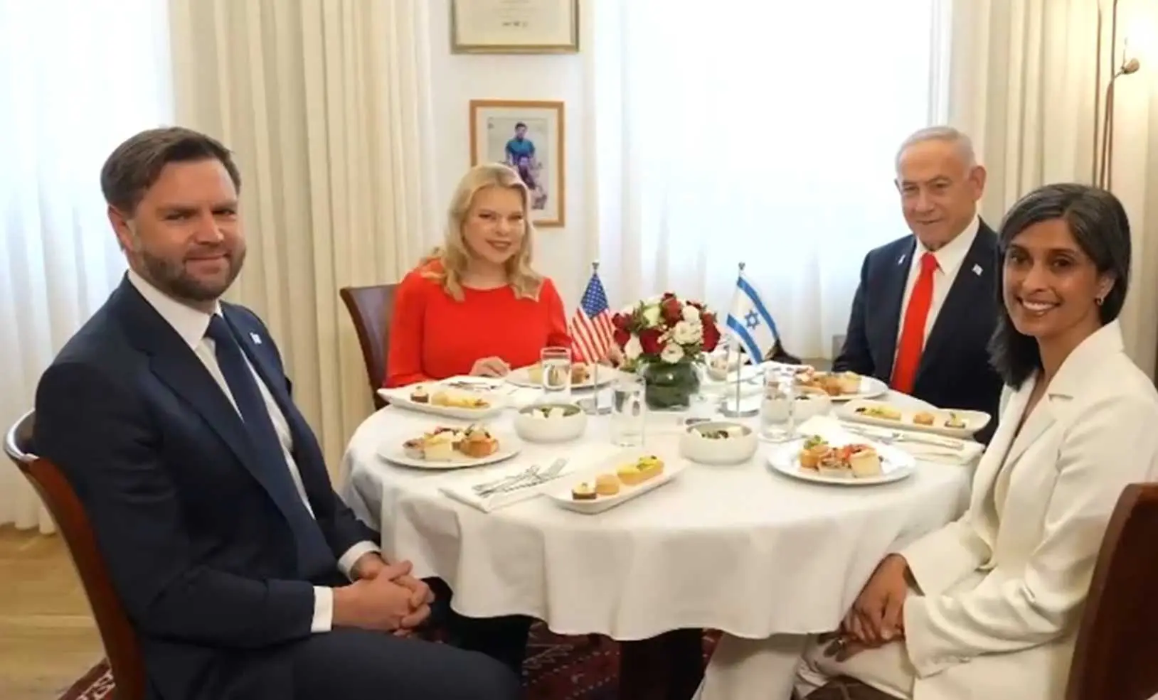 La oficina del primer ministro Benjamin Netanyahu difundió imágenes de él y su esposa, Sara, saludando al vicepresidente estadounidense JD Vance y a la segunda dama, Usha Vance, en su despacho en Jerusalén.