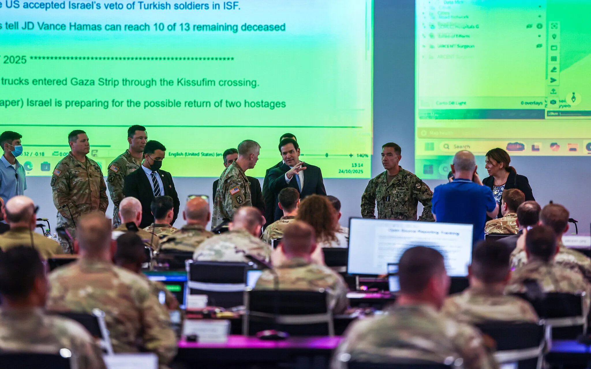 El secretario de Estado de Estados Unidos, Marco Rubio, habla con personal militar estadounidense durante su visita al Centro de Coordinación Cívico-Militar en el sur de Israel, el 24 de octubre de 2025. (Fadel Senna/Pool Photo vía AP)
