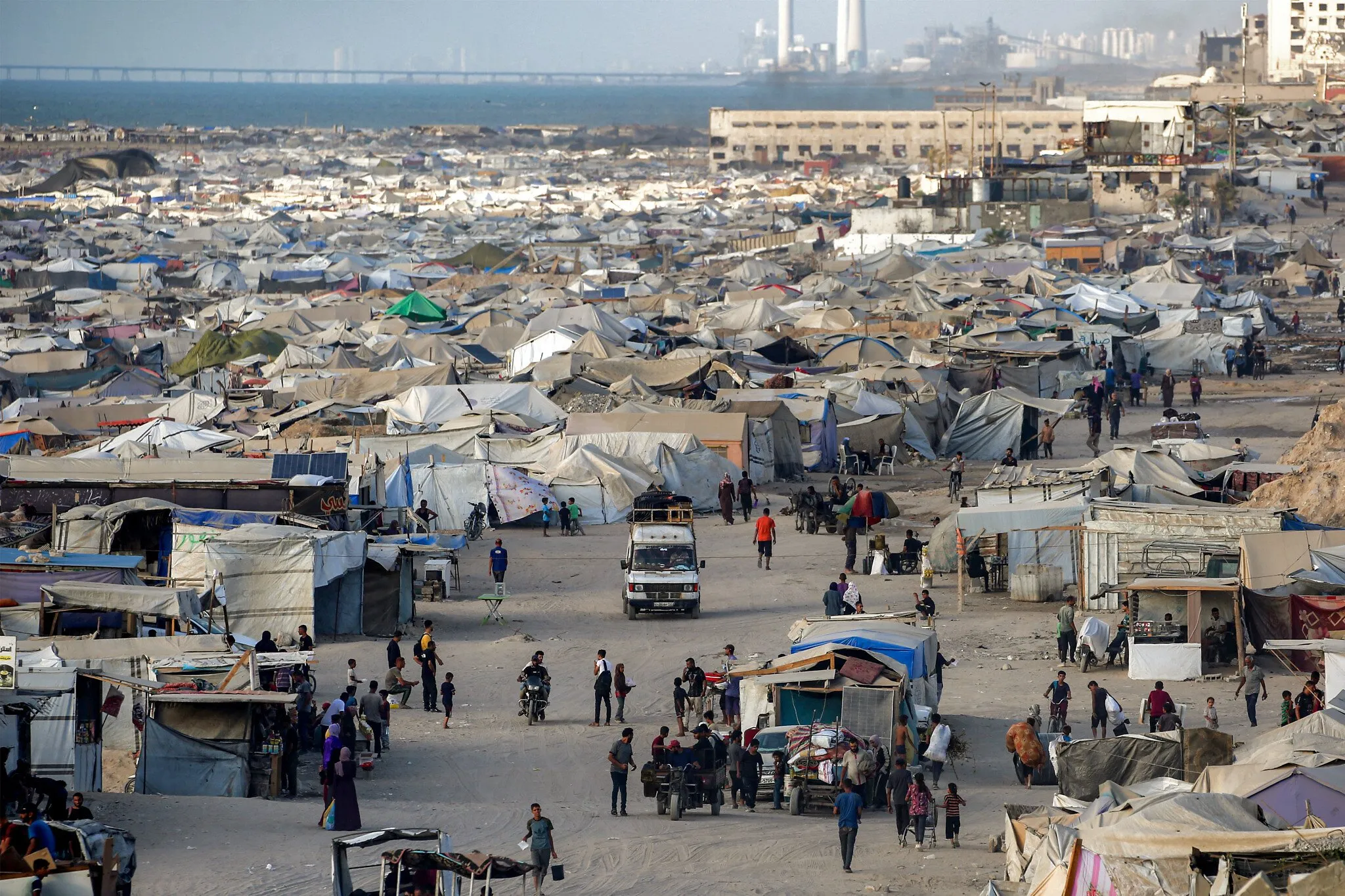 Las tiendas de campaña de las personas desplazadas erigidas a lo largo del paseo marítimo de la ciudad de Gaza se muestran cerca del atardecer del 2 de septiembre de 2025. (Eyad BABA / AFP)