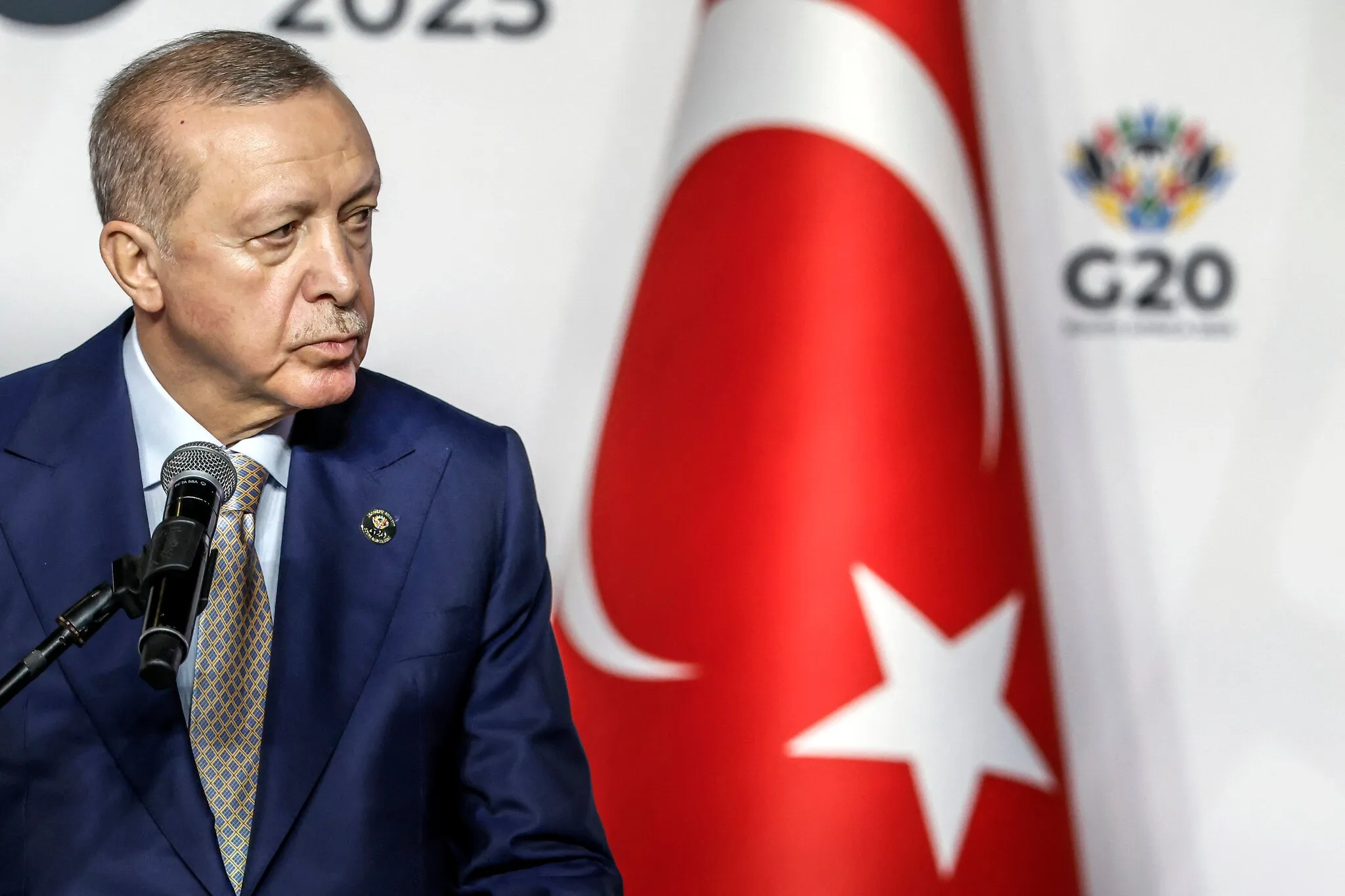 El presidente de Turquía, Recep Tayyip Erdogan, habla durante una rueda de prensa tras la conclusión de la Cumbre de Líderes del G20 en el Centro Nasrec Expo de Johannesburgo el 23 de noviembre de 2025. (Foto de Marco Longari / AFP)