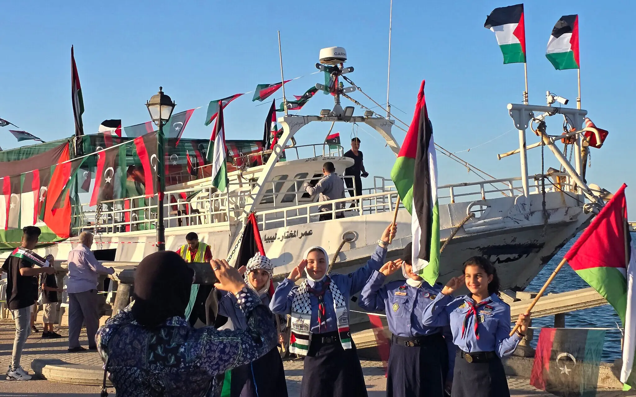 Las niñas exploradoras libias posan para una foto frente al barco Omar al-Mukhtar, un barco libio que zarpó el 17 de septiembre para unirse a la Flotilla Global Sumud, en el puerto de Trípoli el 16 de septiembre de 2025. (Mahmud Turkia / AFP)
