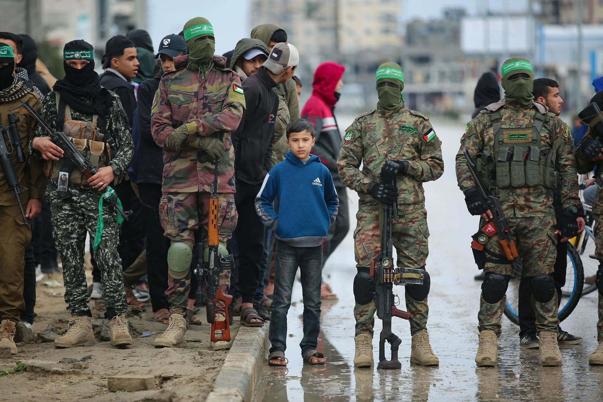 Hombres armados de Hamás con un niño palestino en el acto de entrega de rehenes israelíes a la Cruz Roja, en Nuseirat, en el centro de Gaza, el 22 de febrero de 2025. (Ali Hassan/Flash90)