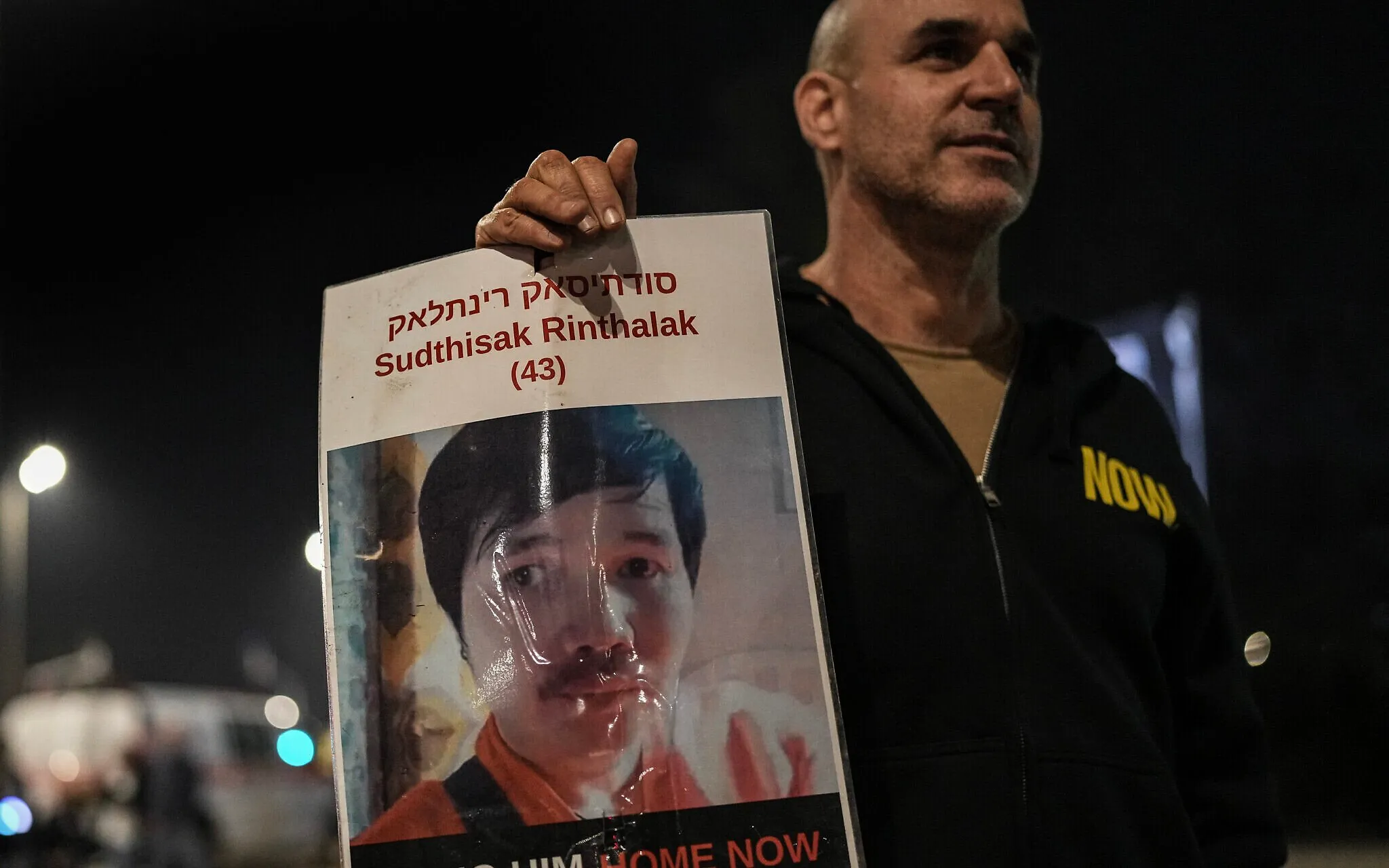 Un hombre sostiene una foto de Sudthisak Rinthalak en un mitin cerca de Sderot que pide la liberación de los dos últimos rehenes cuyos cuerpos están retenidos en Gaza, el 29 de noviembre de 2025 (Tsafrir Abayov/Flash90)