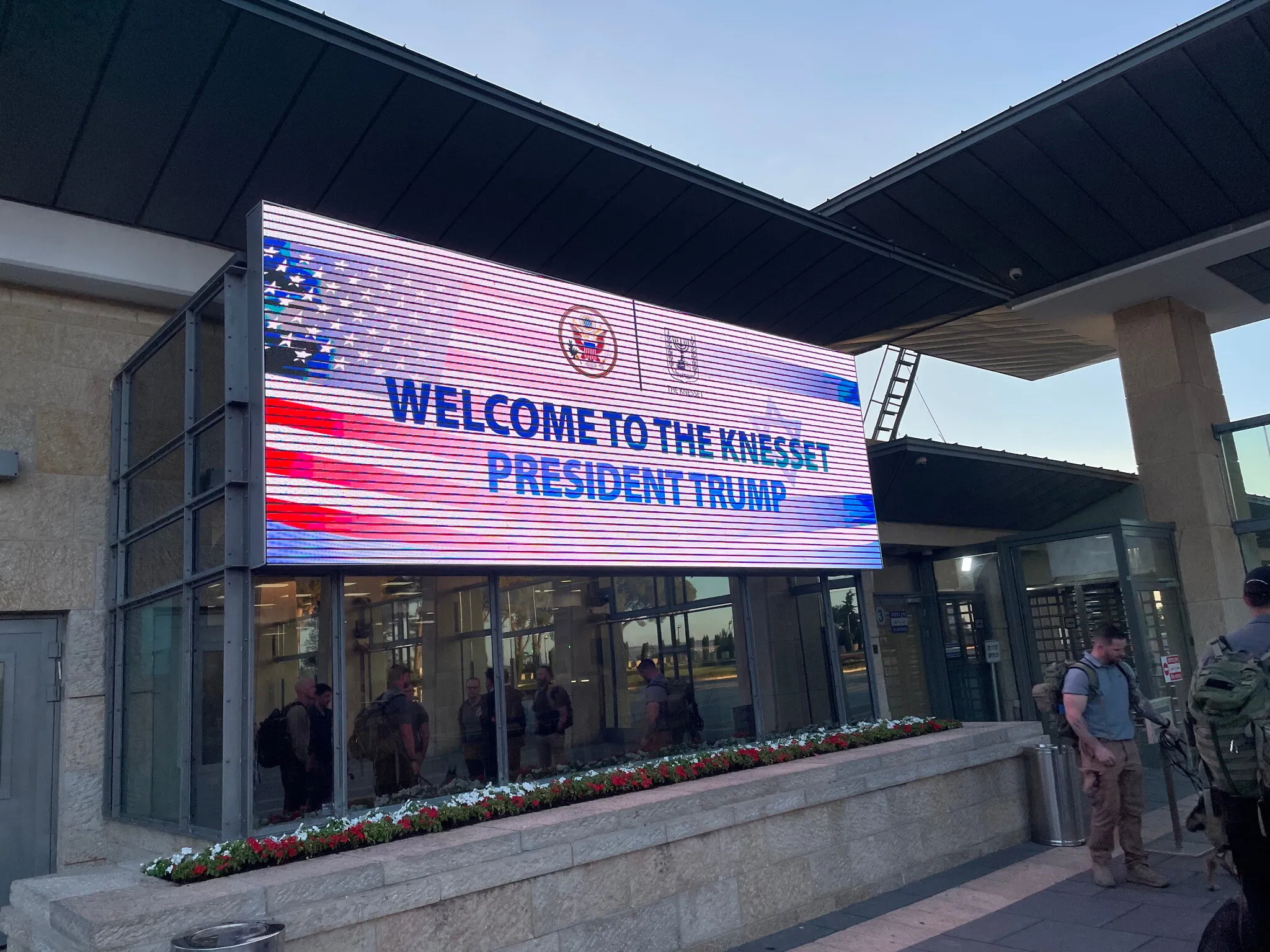 Legisladores, visitantes y periodistas se agrupan en los pasillos de la Knéset antes del discurso del presidente de Estados Unidos, Donald Trump, programado para esta mañana. El edificio del parlamento israelí está decorado con banderas de Israel y Estados Unidos y pantallas electrónicas que anuncian: “Bienvenido a la Knéset, presidente Trump”.