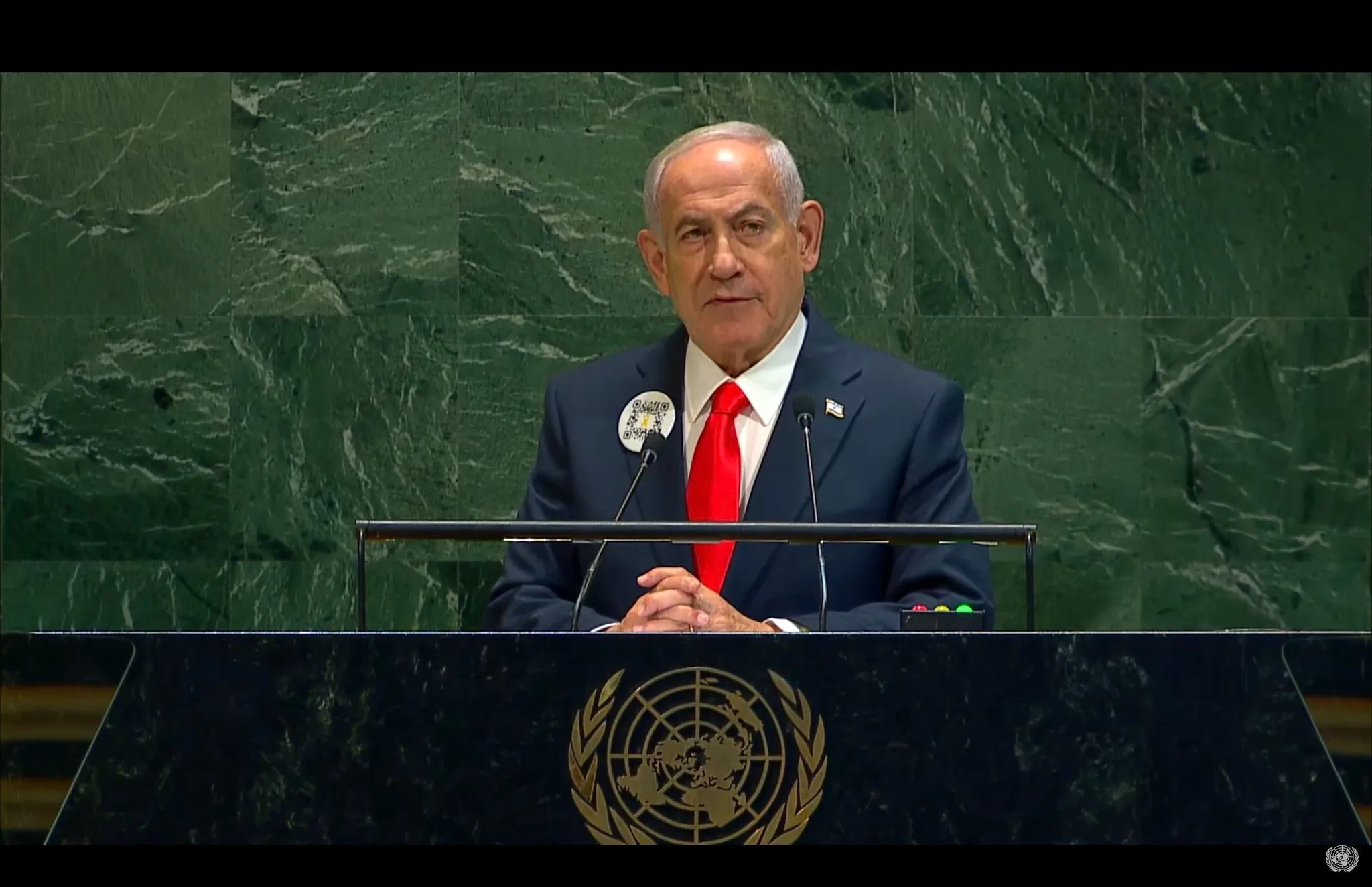 El primer ministro Benjamin Netanyahu comienza su discurso ante la ONU reconociendo a las familias de los rehenes presentes en la audiencia.