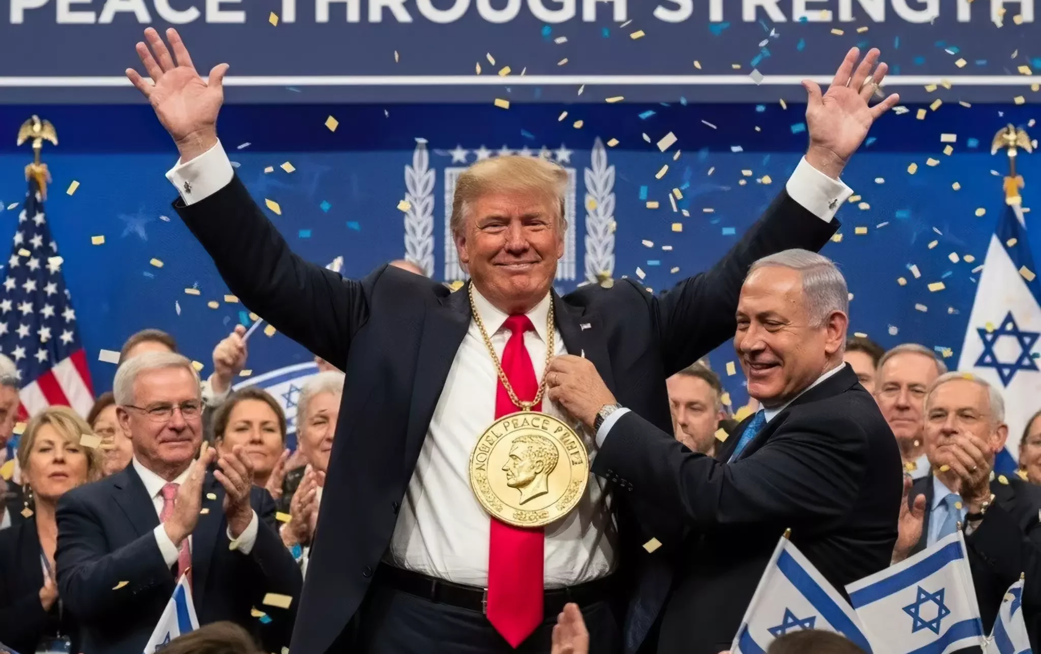En las redes sociales, el primer ministro Benjamin Netanyahu comparte una foto generada por IA del presidente de los Estados Unidos, Donald Trump, con una medalla del Premio Nobel alrededor del cuello, mientras es elogiado por el primer ministro y otros.