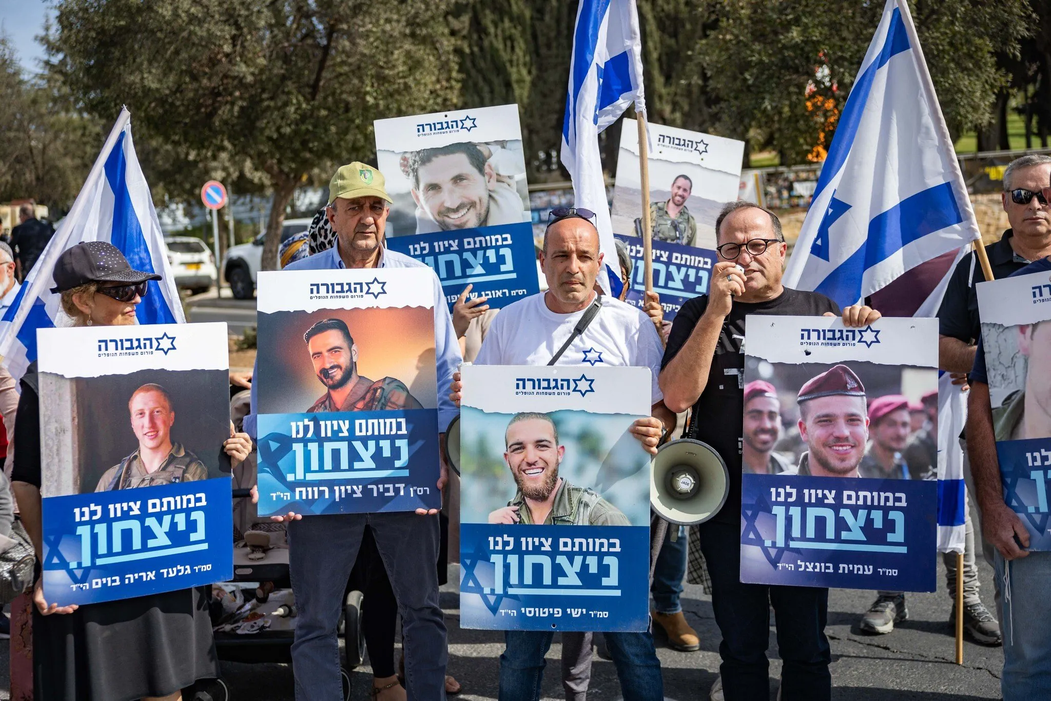 Unas doce personas del Foro Gvura, que agrupa a familias de soldados muertos en la guerra contra Hamás en Gaza, se concentraron frente a la oficina del primer ministro en Jerusalén para exigir la reanudación de las operaciones militares.