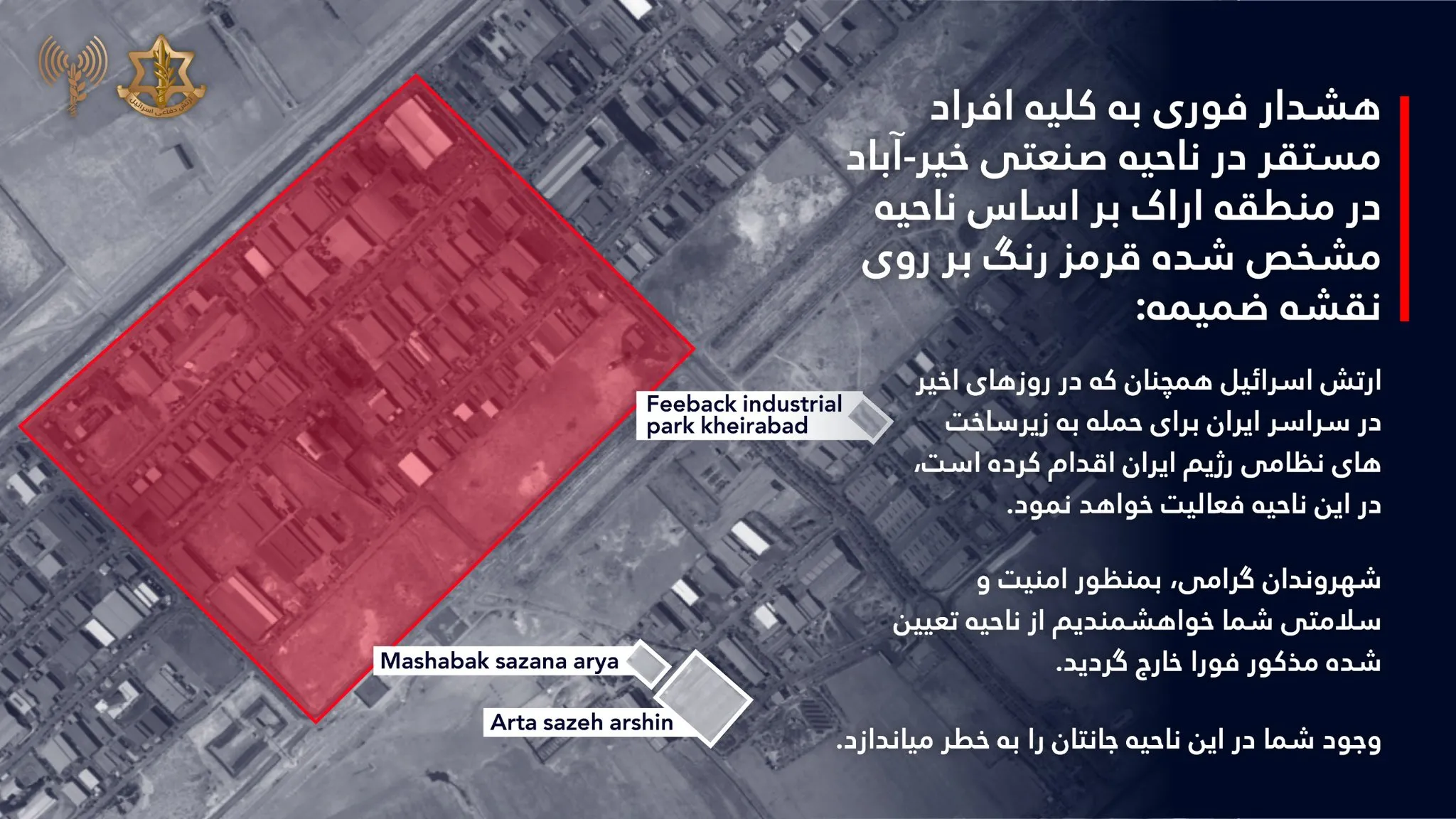 “Alerta urgente para todas las personas que se encuentren en el noroeste de la ciudad de Arak y en la zona industrial de Kheirabad, en la región de Arak. En las próximas horas, las FDI operarán en la zona, tal y como han hecho en los últimos días en todo Irán, para atacar la infraestructura militar del régimen iraní”, afirma en un comunicado el portavoz en persa de las FDI, el teniente coronel (reserva) Kamal Penhasi.