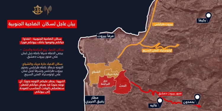 El militar sostuvo que la actividad de Hezbolá en esa zona obliga a Israel a actuar con fuerza. “La actividad terrorista llevada a cabo por Hezbolá en el suburbio obliga al ejército israelí a actuar contra él con la fuerza. No pretendemos hacerles daño. Por su seguridad, deben evacuar inmediatamente”, afirmó.