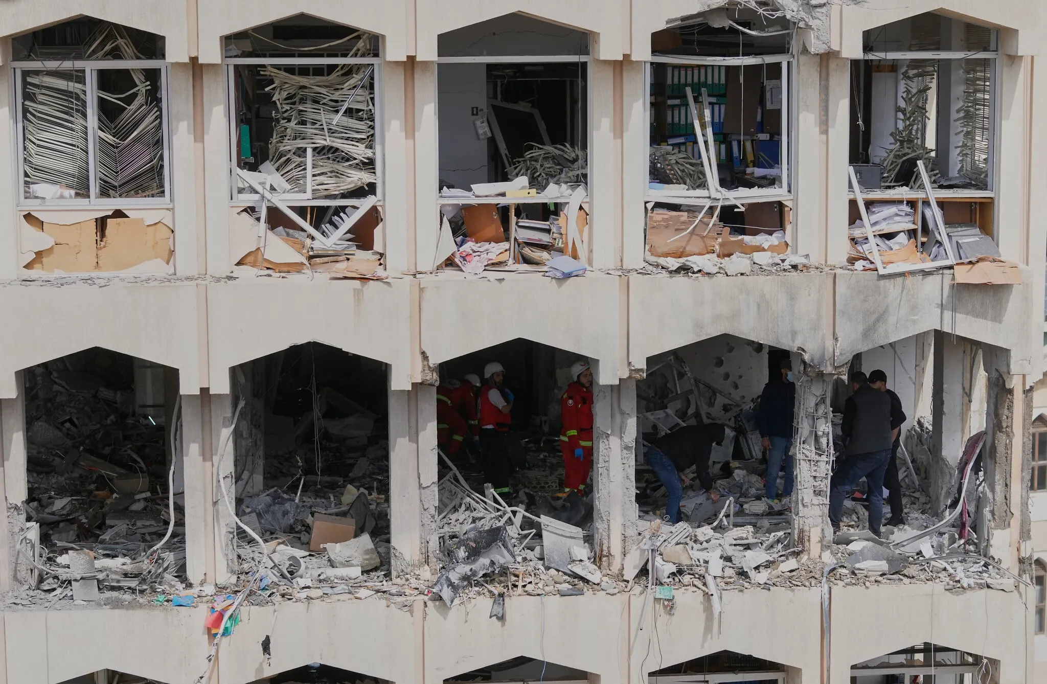 Agentes de seguridad comprueban los daños en un edificio alcanzado por un ataque aéreo israelí en la ciudad portuaria meridional de Sidón, Líbano, el 6 de marzo de 2026. (AP Photo/Mohammed Zaatari)