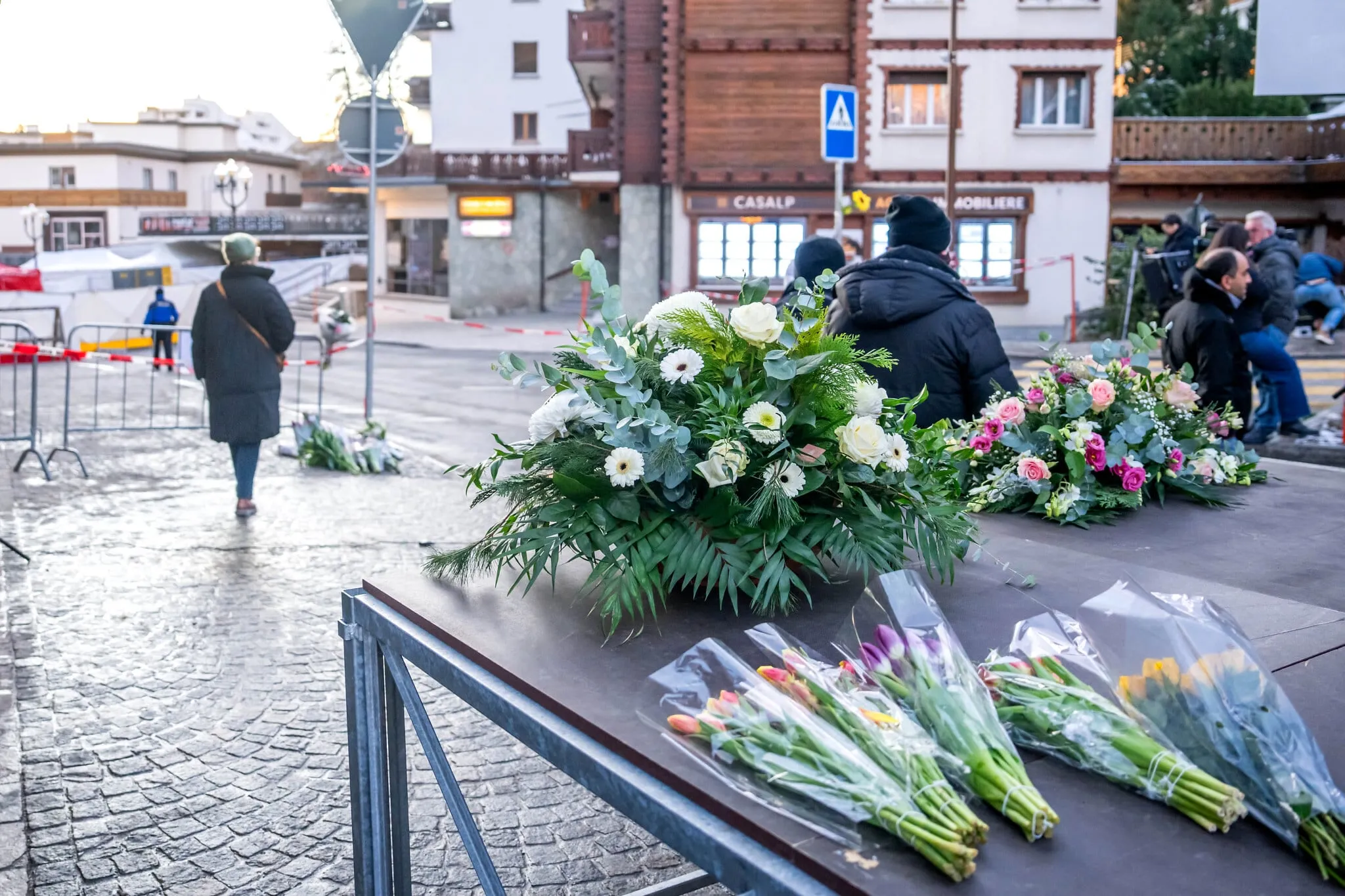 Se depositan flores cerca del lugar donde un incendio arrasó un bar abarrotado en la estación de esquí alpina de Crans-Montana el 1 de enero de 2026. (Maxime Schmid/AFP)