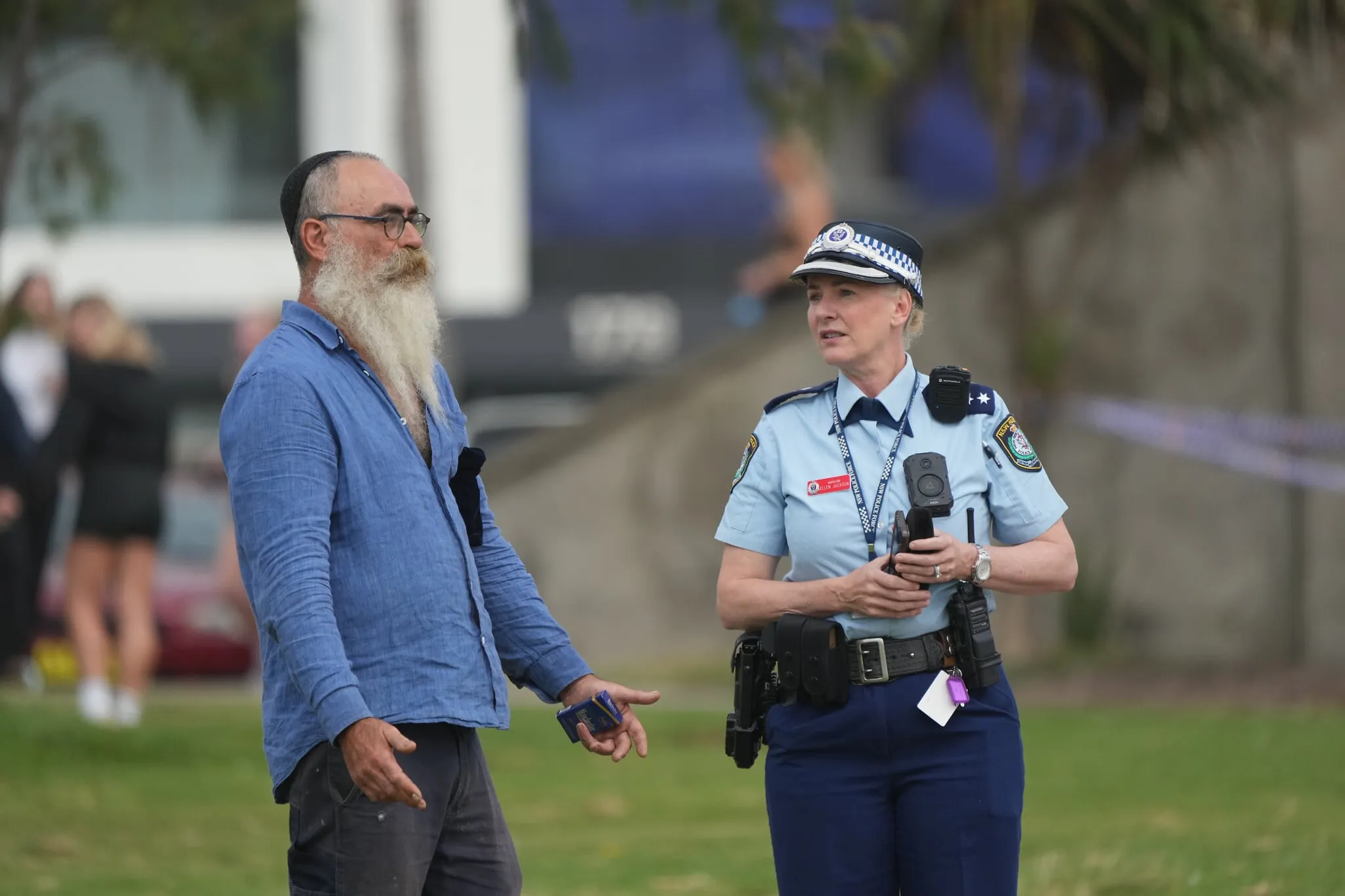 Un agente de policía habla con un miembro del público, tras un tiroteo ocurrido el día anterior en Bondi Beach, Sídney, el 15 de diciembre de 2025. (AP/Mark Baker)