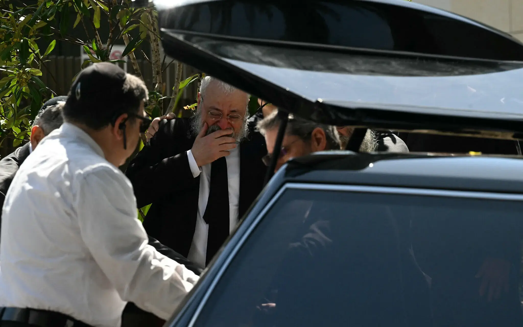 Un familiar del rabino Eli Schlanger, asesinado en el ataque terrorista de Bondi Beach contra un evento de Janucá, reacciona al ver llegar el ataúd para el funeral en la sinagoga Jabad de Bondi en Sídney el 17 de diciembre de 2025. (Saeed Khan/AFP)
