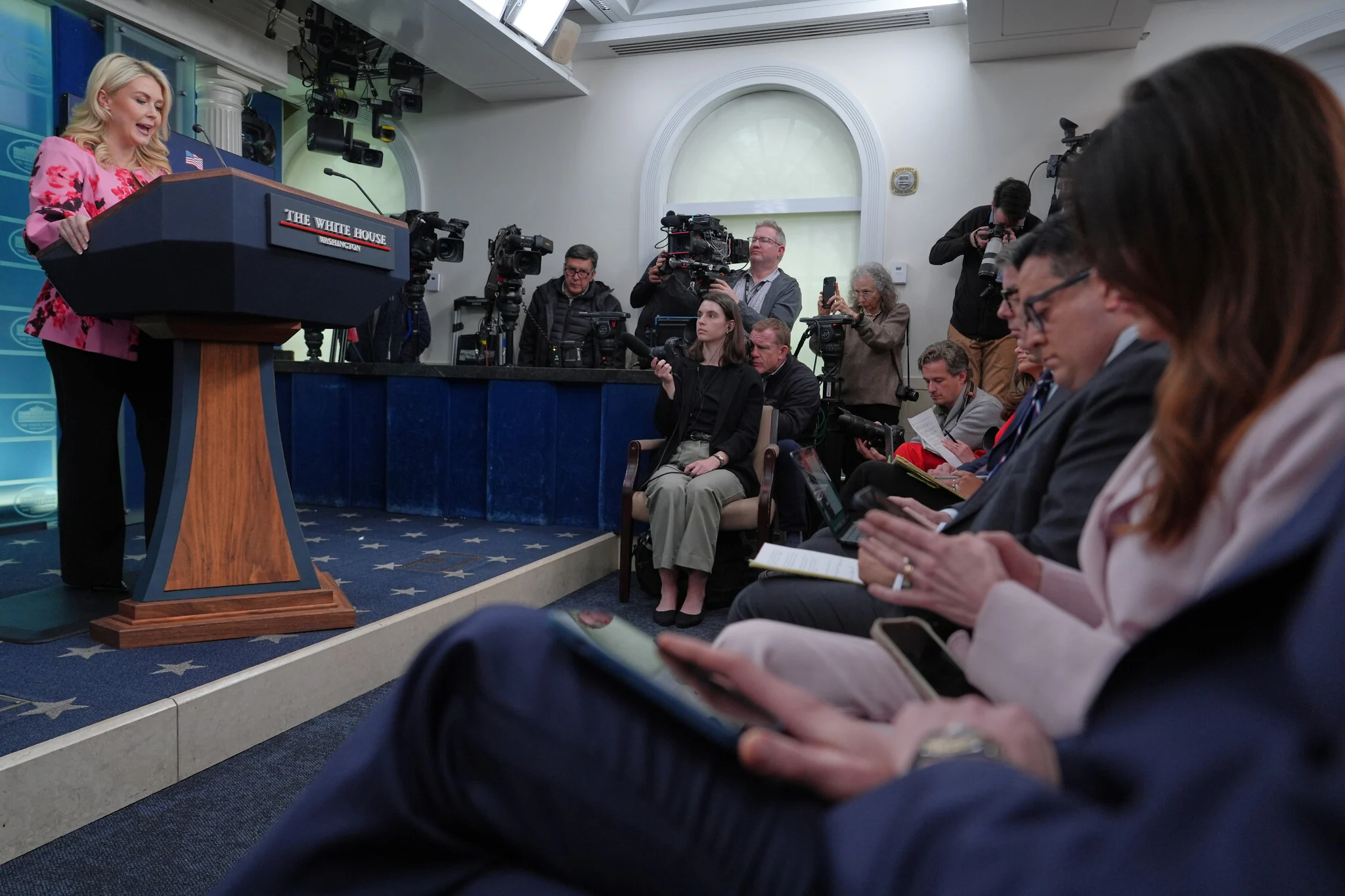 La secretaria de prensa de la Casa Blanca, Karoline Leavitt, habla con los periodistas en la sala de prensa James Brady de la Casa Blanca, el 30 de marzo de 2026, en Washington, D. C. (AP/Alex Brandon)