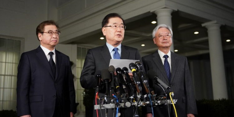El director de seguridad nacional de Corea del Sur, Chung Eui-yong, dijo a los periodistas sobre la reunión prevista frente a la Casa Blanca, después de informar a Donald Trump y otros altos funcionarios estadounidenses sobre una reunión con Kim Jong Un en la capital norcoreana el lunes.