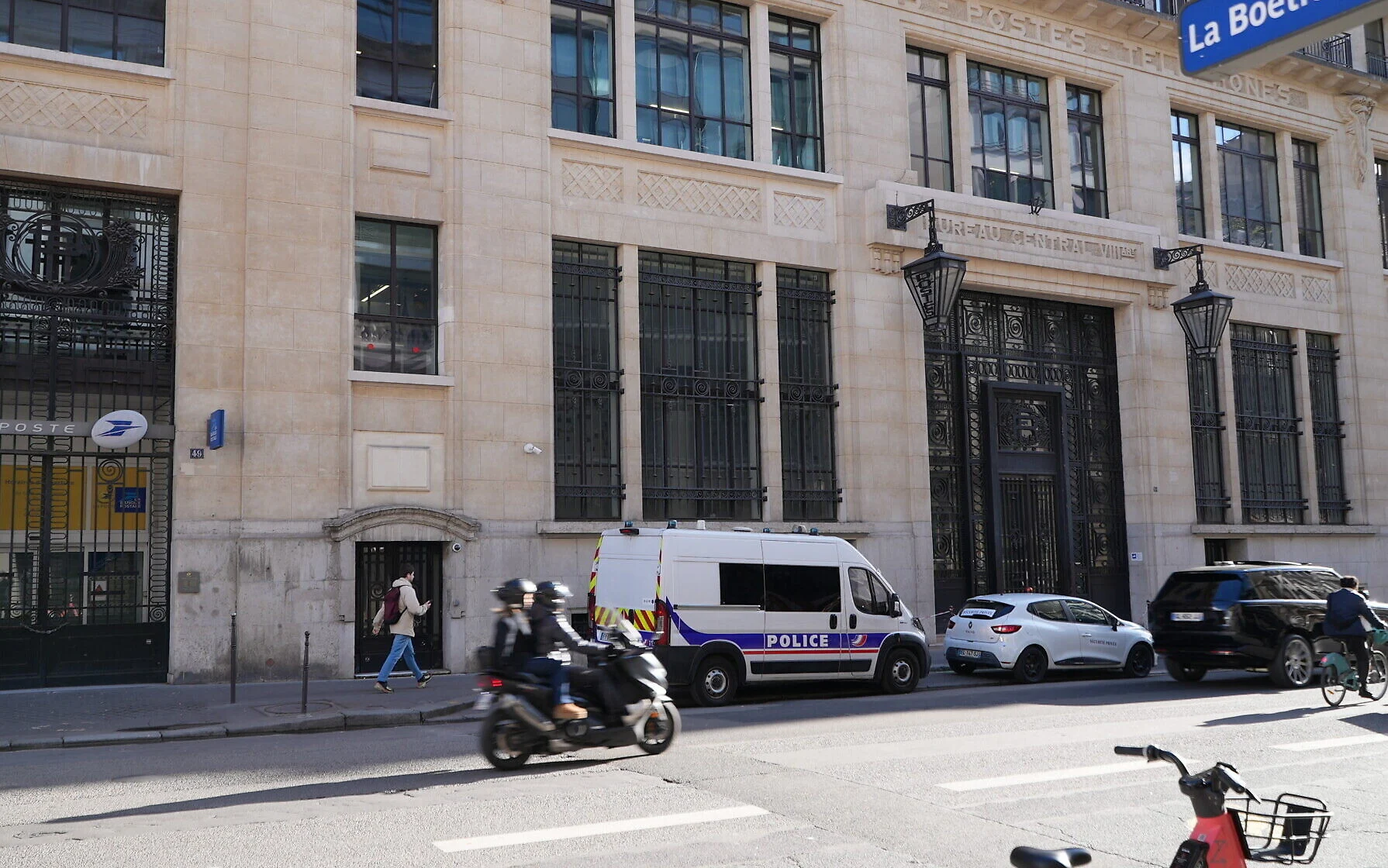 Agentes de la policía francesa frente al edificio del Bank of America en París, el 28 de marzo de 2026. (Foto AP/Nicolas Garriga)