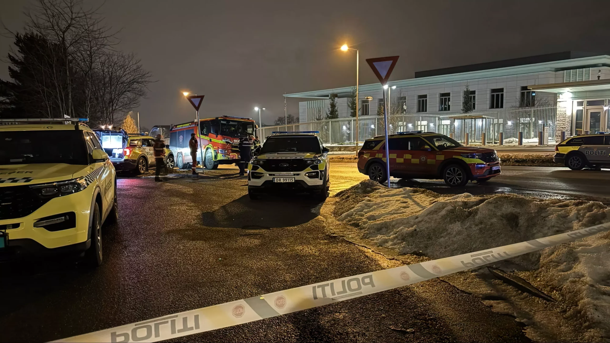 Heavily armed police officers and other emergency services seen outside the U.S. Embassy in Oslo, Norway, following reports of a possible explosion tonight near the Embassy. pic.twitter.com/8lx85QjTVo