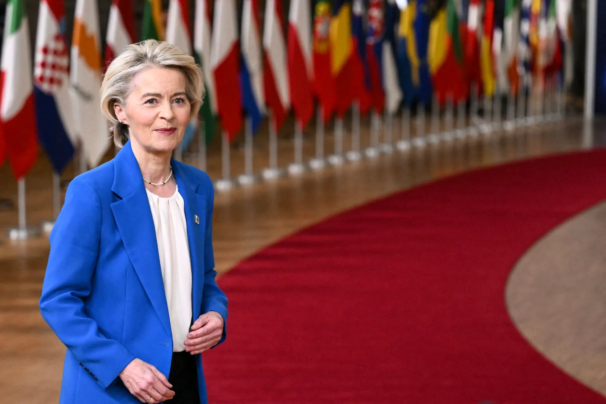 La presidenta de la Comisión Europea, Ursula von der Leyen, observa mientras llega para asistir a la reunión del Consejo Europeo en Bruselas el 18 de diciembre de 2025. (NICOLAS TUCAT / AFP)
