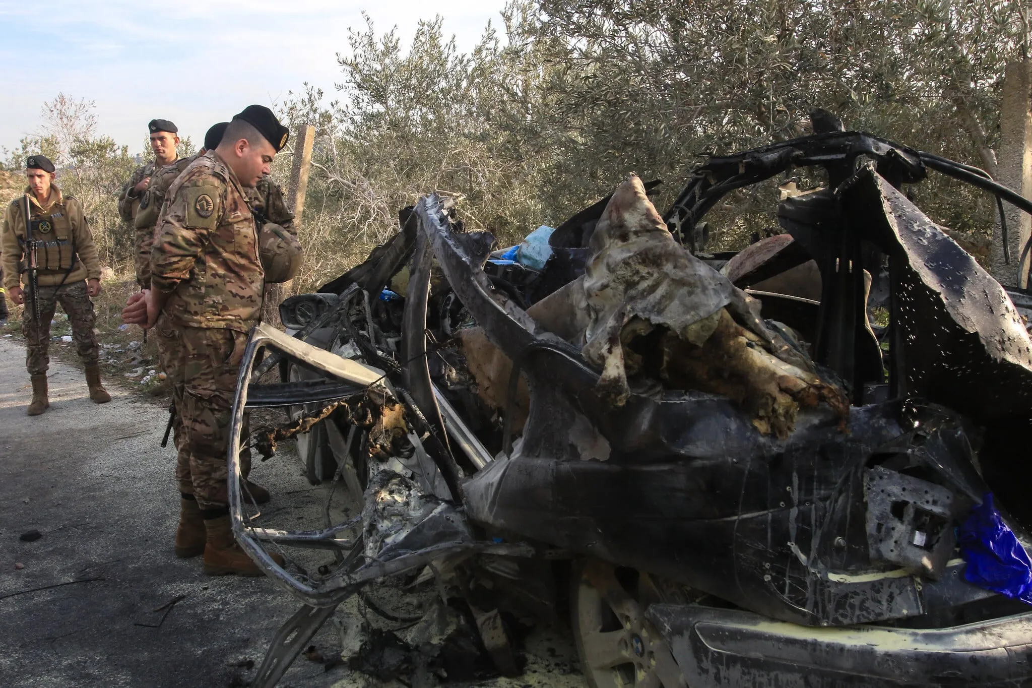 Un soldado del ejército libanés inspecciona los restos de un coche que fue blanco de un ataque aéreo israelí cerca de la aldea de Mazraat al Qnaitra, en el sur del Líbano, el 22 de diciembre de 2025. (Mahmoud ZAYYAT / AFP)