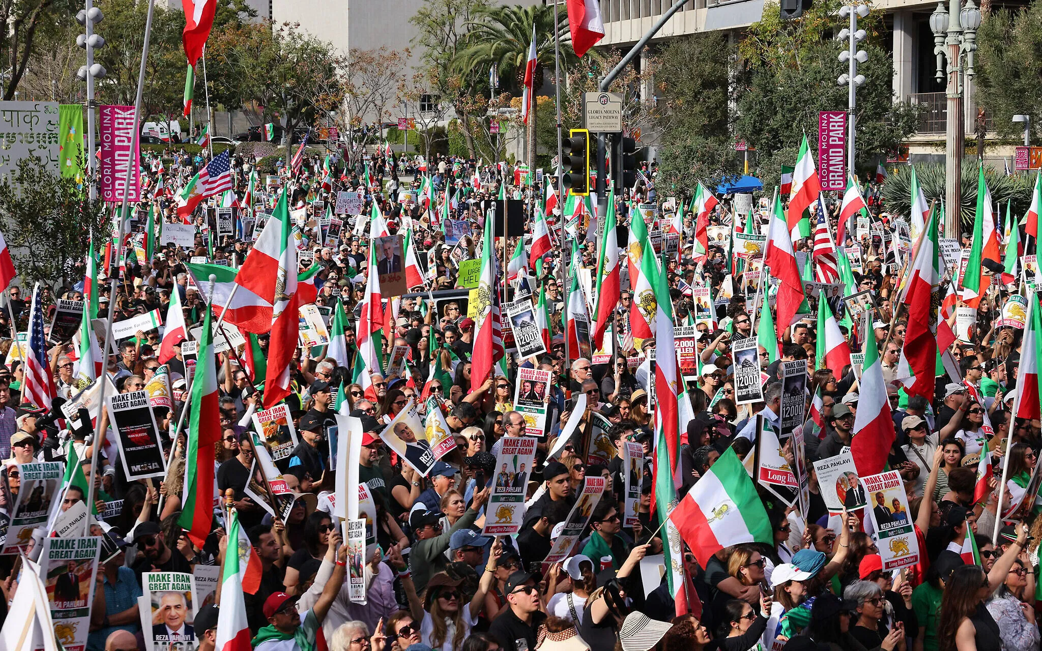 Numerosos manifestantes en la ciudad californiana corearon consignas a favor del presidente estadounidense y de Reza Pahlavi, hijo del exshah iraní derrocado por el levantamiento popular de 1979, figura que despierta apoyos y rechazos dentro de la diáspora.