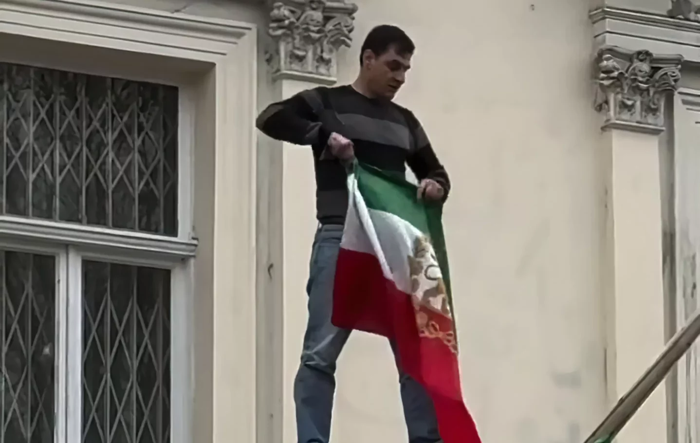 Manifestante sustituye bandera iraní por bandera anterior a Revolución Islámica en embajada en Londres