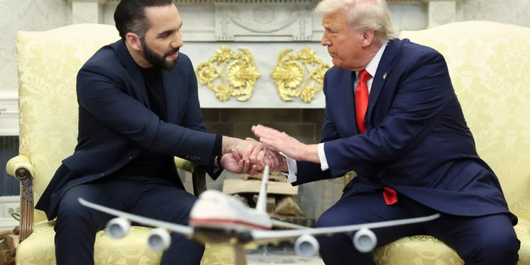 El presidente de Estados Unidos, Donald Trump, a la derecha, estrecha la mano del presidente de El Salvador, Nayib Bukele, durante una reunión en el Despacho Oval de la Casa Blanca en Washington, el 14 de abril de 2025. (Pool vía AP)