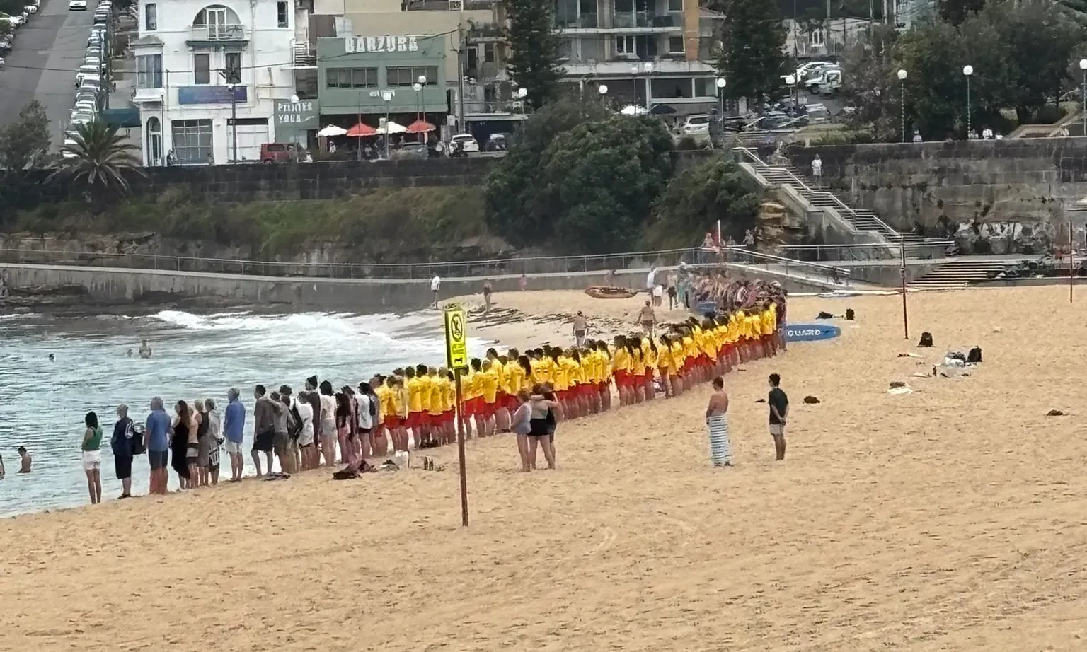 Socorristas australianos se alinearon en la orilla de la playa Bondi, en Sídney, y mantuvieron silencio para honrar a las 15 personas asesinadas tras un ataque terrorista, con disparos contra la multitud durante un festival judío que celebraba Jánuca junto al mar, frente a la costa urbana.