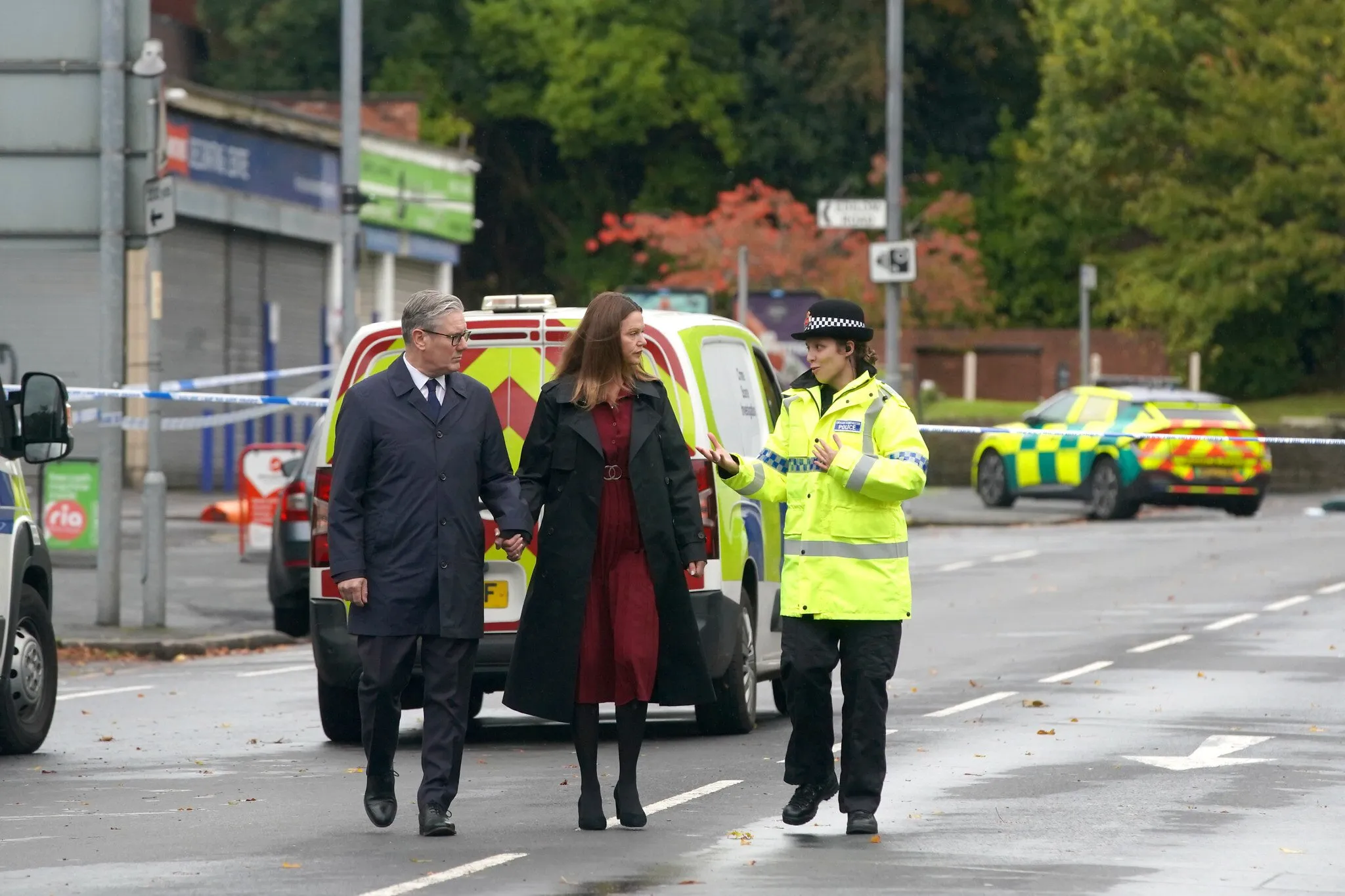 El primer ministro británico, Keir Starmer, y su esposa, Victoria, llegan para reunirse con los servicios de emergencia cerca de la sinagoga de la Congregación Hebrea de Heaton Park en Mánchester, Inglaterra, el 3 de octubre de 2025, donde dos personas murieron en un atentado terrorista el jueves. (Foto AP/Ian Hodgson)