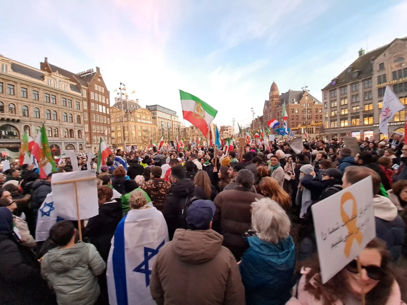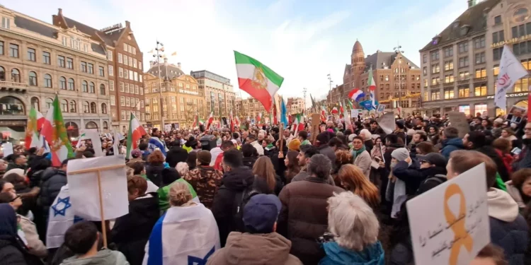 En Dam Square, en Ámsterdam, se realizó este sábado una manifestación masiva en Dam Square, en Ámsterdam en la que los asistentes reclamaron un cambio de gobierno en Irán. Entre banderas iraníes e israelíes, los participantes expresaron su respaldo a la guerra y al pueblo iraní, y exigieron la liberación del país del actual régimen. Frente a ellos se reunió también un grupo propalestino en rechazo a Israel.