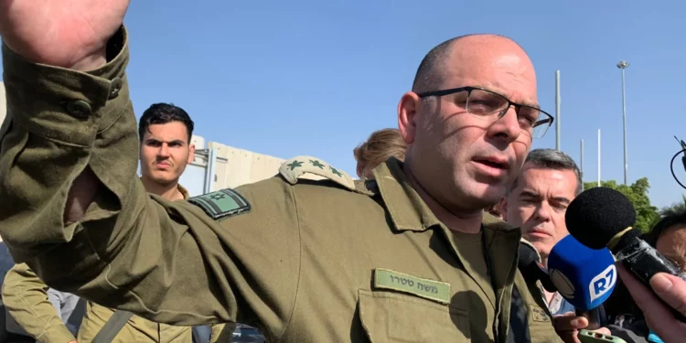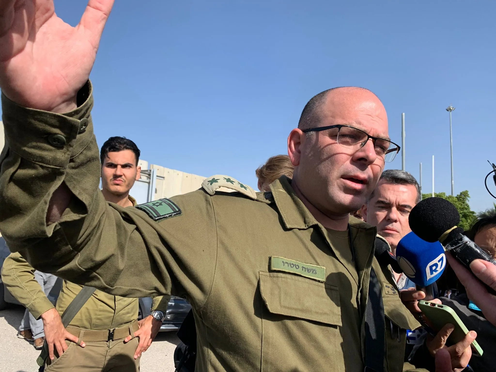 El coronel Moshe Tetro habla durante una rueda de prensa en el paso fronterizo de Kerem Shalom con Gaza el 10 de enero de 2024. (Charlie Summers/Times of Israel)