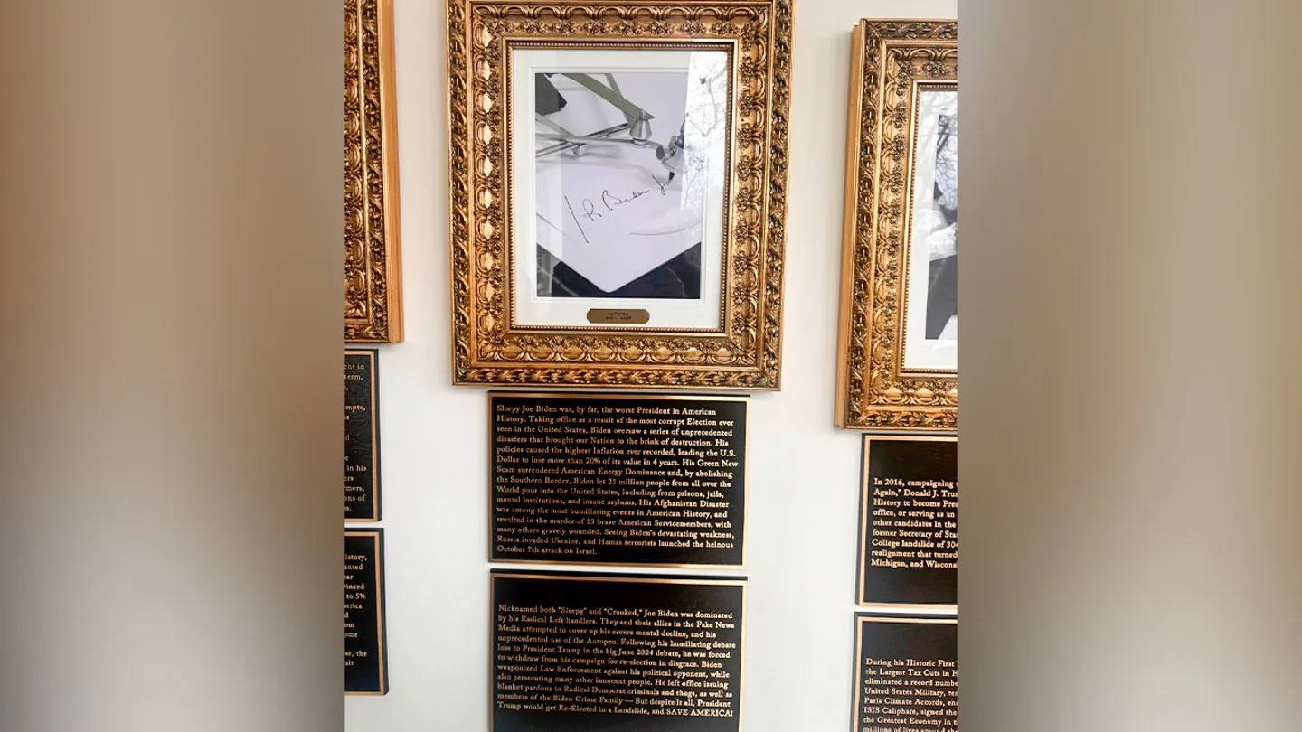 “Apodado tanto “Sleepy” como “Crooked”, Joe Biden estaba dominado por sus asesores de la izquierda radical. Ellos y sus aliados en los medios de comunicación falsos intentaron ocultar su grave deterioro mental y su uso sin precedentes del Autopen”, reza la segunda placa. “Tras su humillante derrota frente al presidente Trump en el gran debate de junio de 2024, se vio obligado a retirarse de su campaña de reelección en desgracia”.