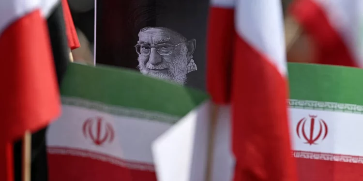 Un manifestante sostiene una pancarta con una imagen del difunto líder supremo iraní, el ayatolá Alí Jamenei, rodeado de banderas iraníes, frente al consulado de Estados Unidos durante una protesta contra el conflicto en Oriente Medio en Ciudad de México, el 7 de marzo de 2026. (Carl de Souza / AFP)