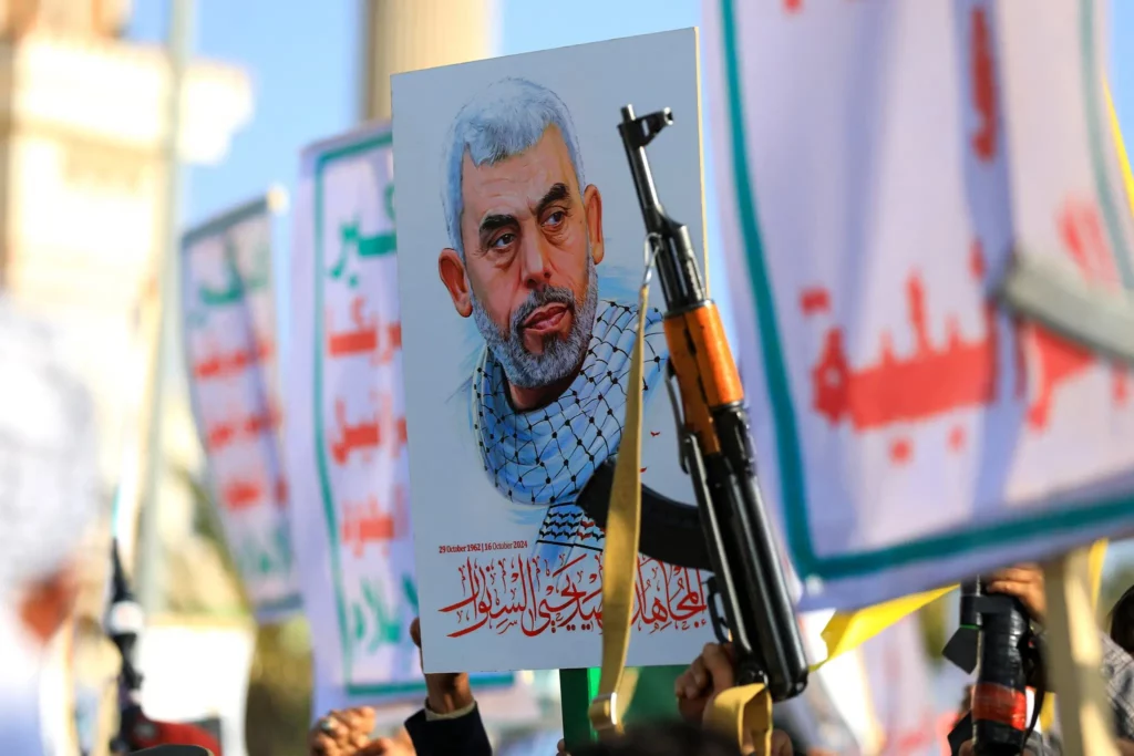 Yemeníes blanden rifles y sostienen una foto del líder terrorista de Hamás, Yahya Sinwar, asesinado, durante una manifestación en solidaridad con Gaza en Saná, la capital controlada por los hutíes, el 29 de noviembre de 2024. (Mohammed HUWAIS / AFP)