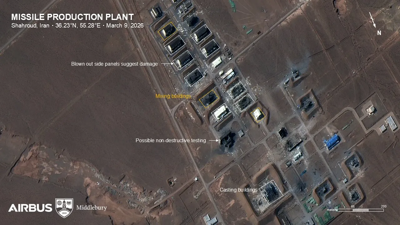 Otra imagen, obtenida por Airbus, muestra varios edificios destruidos y afectados en una planta de producción de misiles situada en Shahrud.