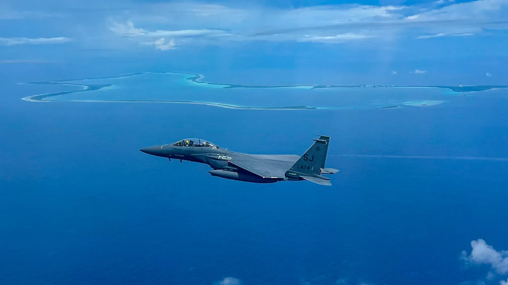 Otra foto de un F-15E Strike Eagle del 336º EFS volando cerca de Diego García el 1 de junio de 2025. (Crédito de la imagen: foto cortesía de la Fuerza Aérea de EE. UU.)