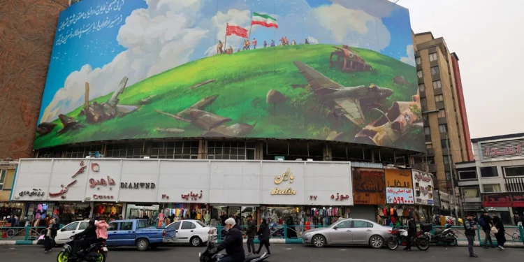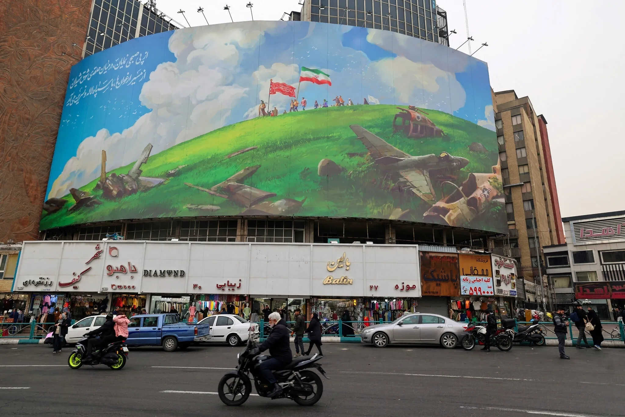 Un iraní pasa en ciclomotor junto a una enorme valla publicitaria que muestra aviones israelíes y estadounidenses estrellados, colocada en un edificio de la plaza Valiasr de Teherán el 8 de febrero de 2026. (ATTA KENARE / AFP)