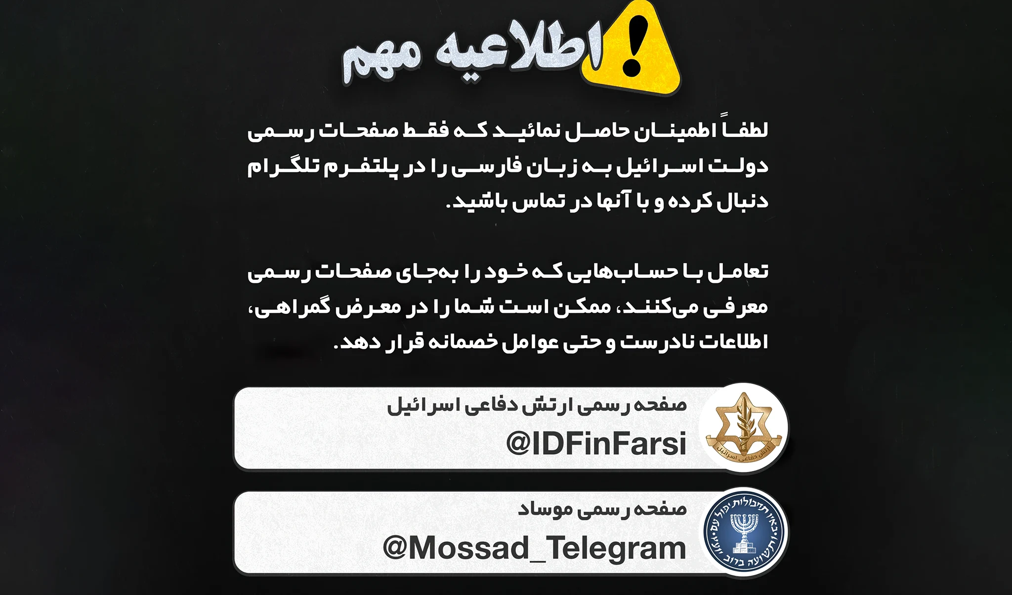 Esa formulación buscó concentrar cualquier acercamiento en enlaces y perfiles difundidos por las propias instituciones israelíes. Al mismo tiempo, canales en persa vinculados a la comunicación oficial de Israel repitieron el énfasis en la autenticidad de los contactos y reforzaron la idea de seguir exclusivamente las referencias que aparecían en la publicación original.