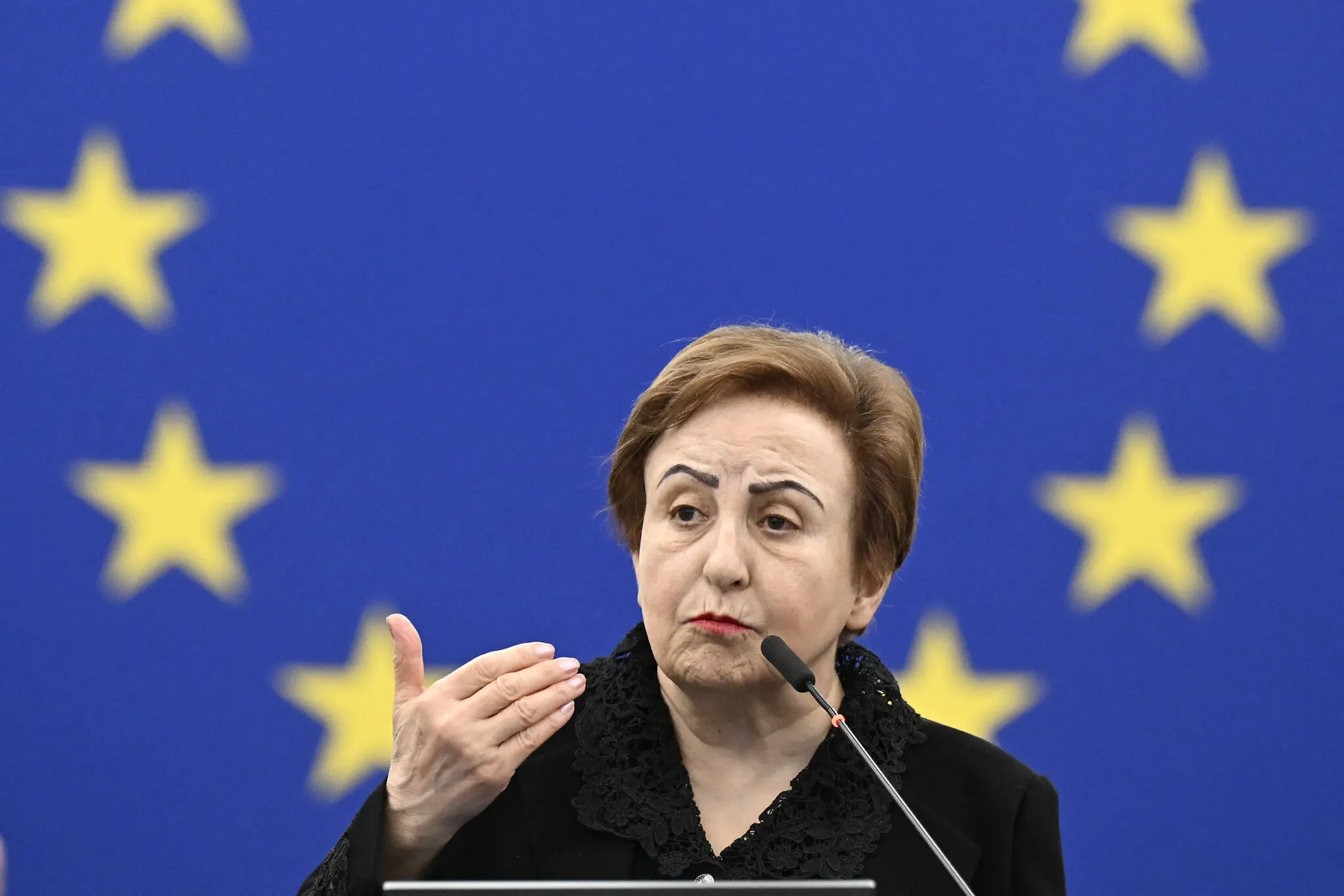 La premio Nobel iraní Shirin Ebadi habla durante una ceremonia para celebrar el Día Internacional de la Mujer, en el Parlamento Europeo en Estrasburgo, este de Francia, el 15 de marzo de 2023. (Foto de Frederick FLORIN / AFP)